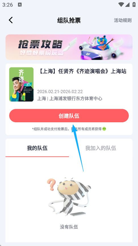 3、点击创建队伍可以拉朋友一起来助力抢票,或者点击右侧加入其他的队伍抢票