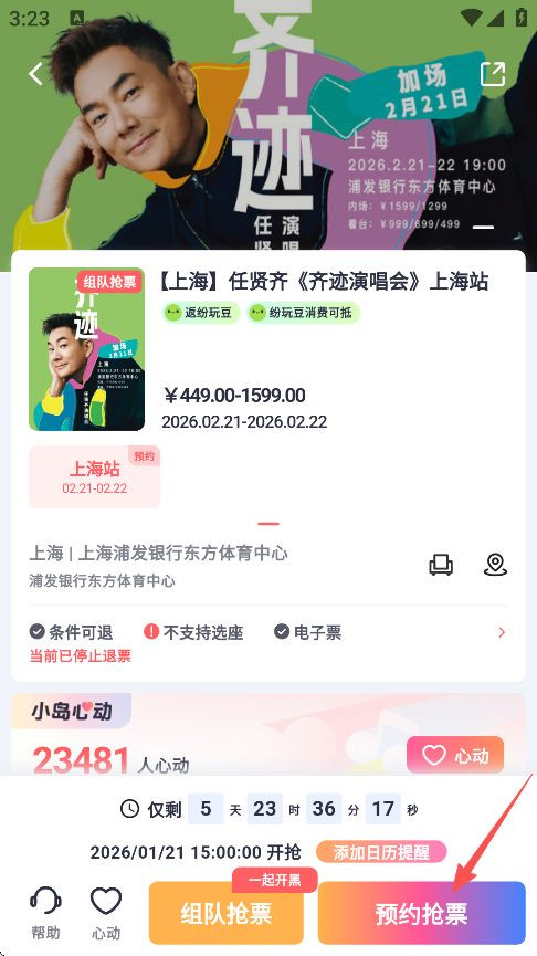 2、查看相关演唱会的详细信息以及注意事项,随后点击屏幕右下角的“预约抢票”。