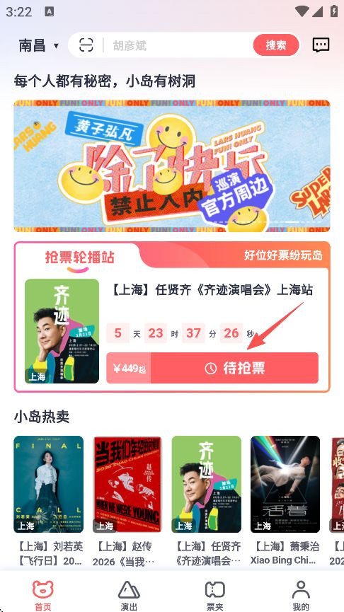 1、下载并打开纷玩岛app,登录进入首页,首页有各种演唱会购票预热链接,点击购票栏。
