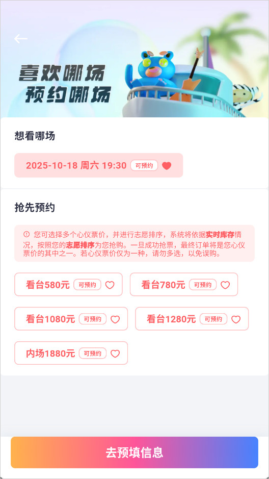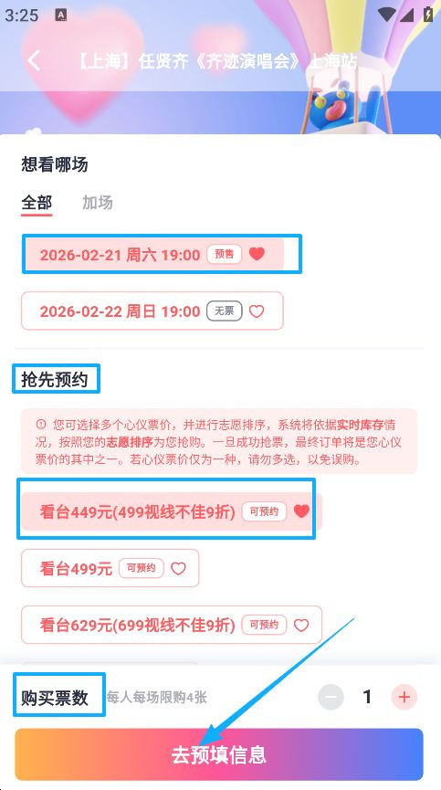 3、选择具体哪一场演唱会的票,随后抢先预约演唱会的看台位置,用户可以根据需求自由选择,再选择购票数量,最后点击屏幕下方的“去预填信息”。