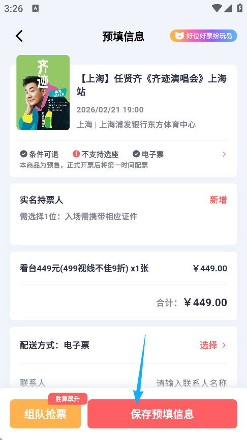5、下单后用户需要填写持票人信息(姓名、证件类型及号码)、配送方式、联系人、联系方式等,点击立即支付即可购票成功。