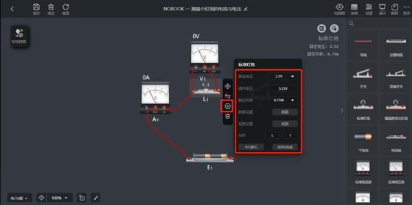 选中任意器材后,可在属性面板中修改实验参数,如电压、电流或距离等。