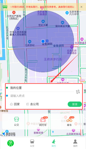 4、进入出行规划界面输入当前位置与目的地,即可获取推荐出行路线。