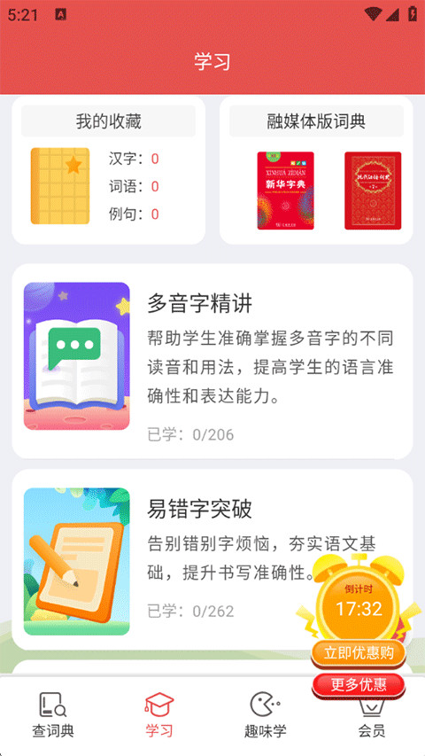 6、点击屏幕下方的学习按钮,在这里有各种如多音字精讲、易错字突破等精品课程,对于刚上学的儿童用户或想查缺补漏的学字用户是非常合适的。
