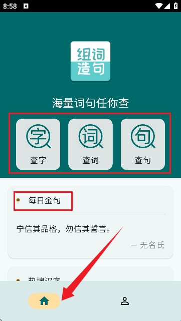 首页提供查字查词及每日推荐功能。