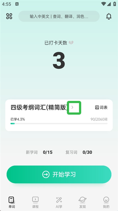 打开应用后进入词书页面,点击对应入口图标进入学习设置区域。