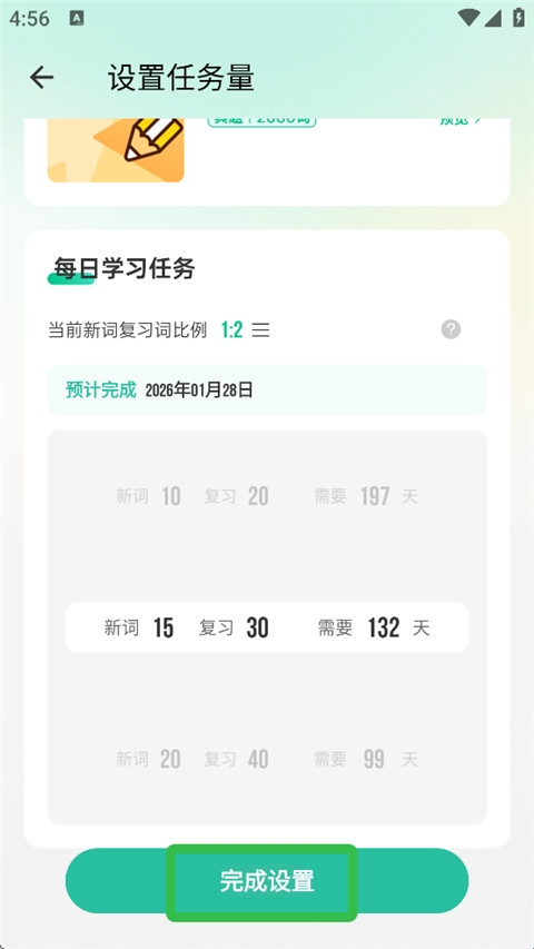 根据自身节奏修改每日目标后提交设置,即可完成学习量更新。